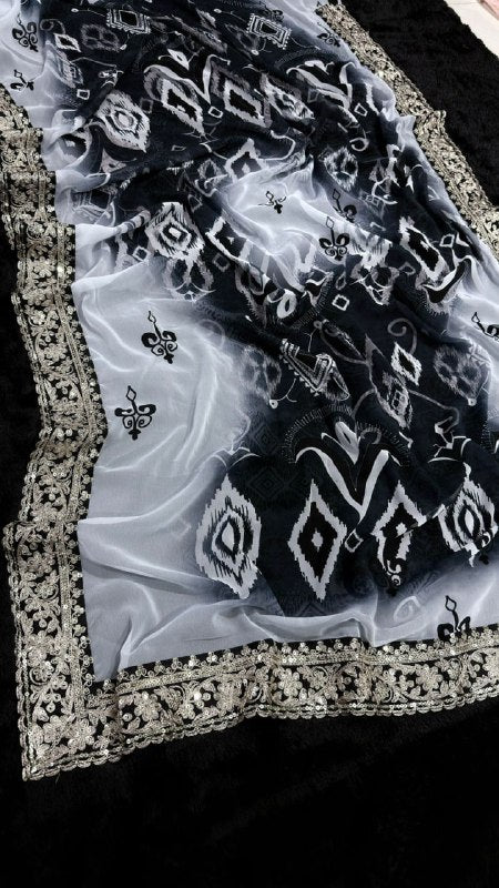 Georgette Digital Print With Embroidery Lace Codding & Sequins Work Saree
