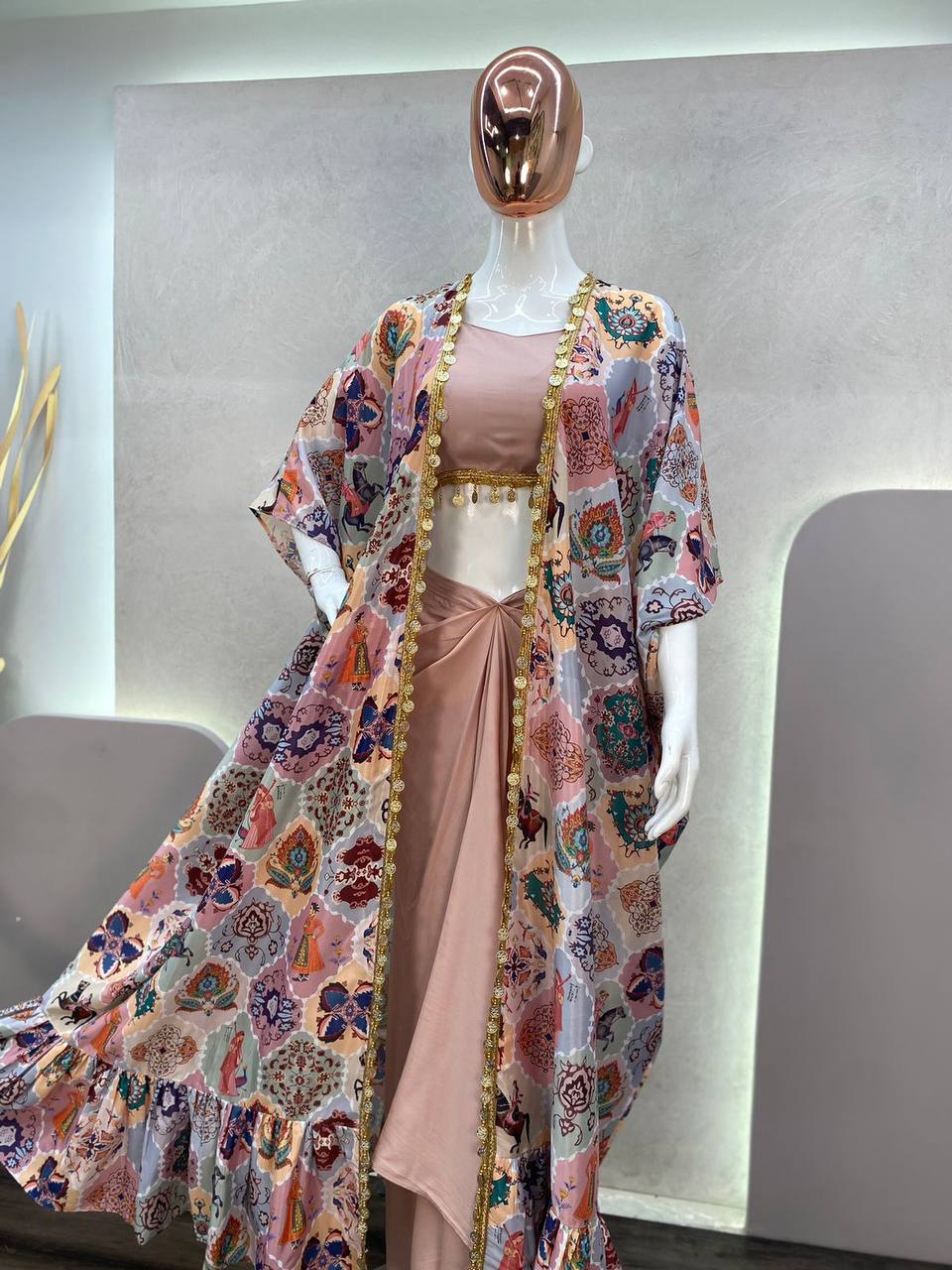 Peach Color 3 Piece Set With Digital Print Shrug Western Party Wear
