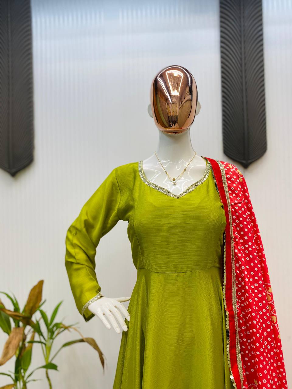 Regal Anarkali Suit Set with Traditional Red Bandhani Dupatta